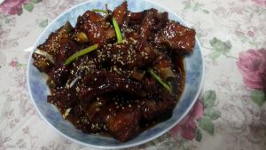 煎锅放一碗水左右,加入老抽,盐,糖,差不多冒泡厉害的时候放入炸好的排骨,收干汤汁到粘稠关火,加入醋,迅速翻炒