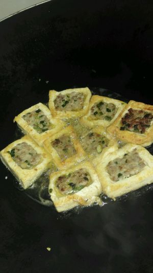 热锅倒油,需要多一点的油, 把装好肉馅的豆腐放入锅,先煎有肉馅的一面,