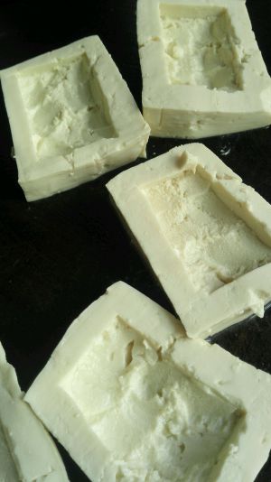北豆腐洗净后切成小块,用勺子挖出一个凹槽。