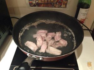 4,将炒锅加底油,将调好的调料倒入,再把排骨倒入翻炒至汁匀沾到排骨上出锅