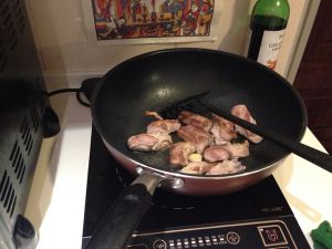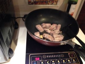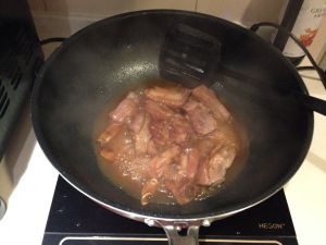油锅少油,放入姜沫小炒,香气出来后放入炸好的排骨,酱油(生抽70%,老抽30%),料酒,适量水,糖