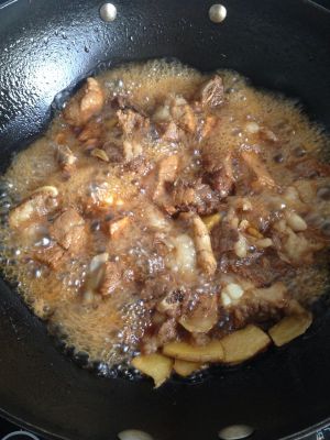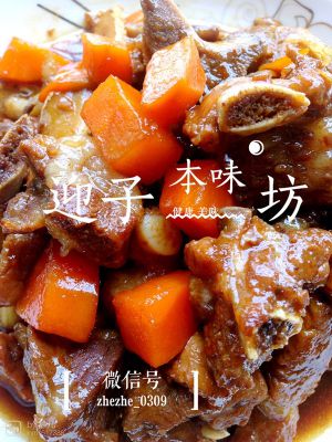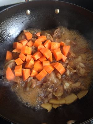 当锅中汁水烧掉一半时,加入切成丁块的胡萝卜(ps:我喜欢荤素搭配,颜色上也很美。这个环节可有可无,假如喜欢胡萝卜煮的透一点,也可以早点放)