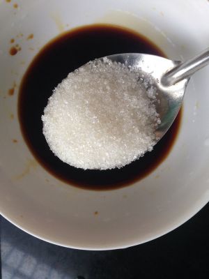 将米酒、酱油、白糖、米醋按1:2:3:4的比例混合成糖醋汁,我做的时候就是一勺米酒,两勺酱油,三勺白糖,四勺米醋(ps:我觉得这个简直就是黄金比例啊,不过假如有人喜欢酸一点或者甜一点,可适当加醋或白糖噢)