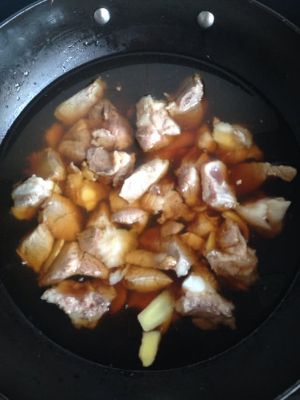 放入葱姜蒜和八角,放入热开水,开水到排骨的一半,大火后转小火,看看汤汁浓稠了就关火