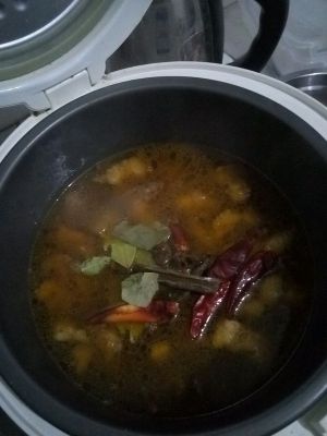将炒好的肉倒入电饭煲里,倒入开水淹没肉就可以了,放入适量干辣椒、香叶、八角、桂皮。用电饭煲煲到肉软了,大概40分钟