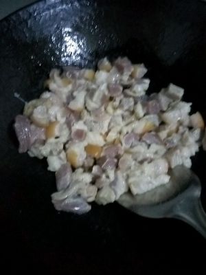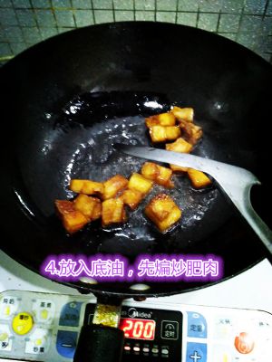 放底油,加入肥肉煸炒
