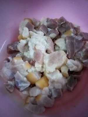绰好水后,切成小块,放入盐、料酒、酱油、老抽腌渍3个小时