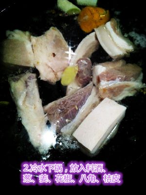 切成中快,冷水下锅,放入料酒、葱姜、花椒、八角、桔皮