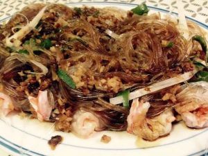 粉丝热水烫开放盘里铺好,处理好的虾摆上
