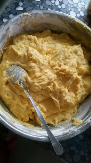 再加一勺糖,喜欢甜的可多加,和南瓜1:1的比例加入糯米粉,和匀(糯米粉分次加入,不要一次到入)