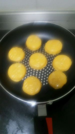 蒸好后的饼放进平底不粘锅里煎(注意是煎,不是炸),要少油小火,煎至两面金黄就可以了