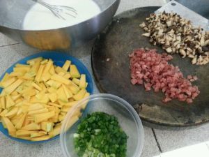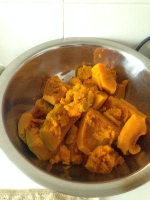 切一小段南瓜,放入微波炉里蒸熟,去皮去籽,碾压成泥