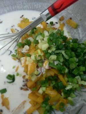 材料全部切好,面粉加水搅拌均匀,面糊稍微浓稠一点