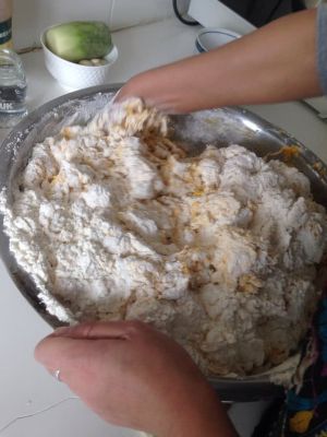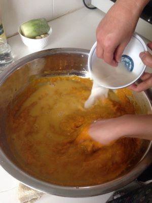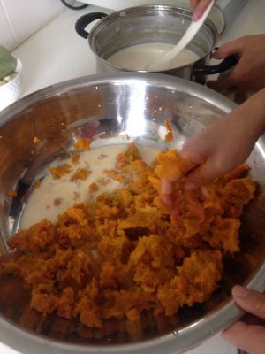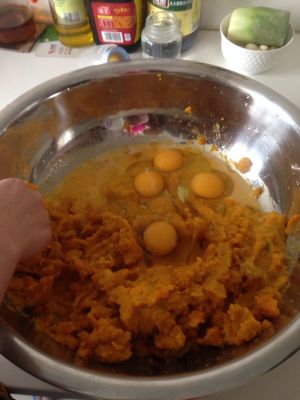 在碾好的南瓜泥中,不停加入面粉搅拌均匀,直至不沾手