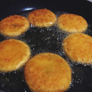捏成饼状,放入热的油锅中炸,若有芝麻,可在表面撒上少许