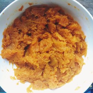 将蒸好的南瓜滤水,加40克白糖,捣碎