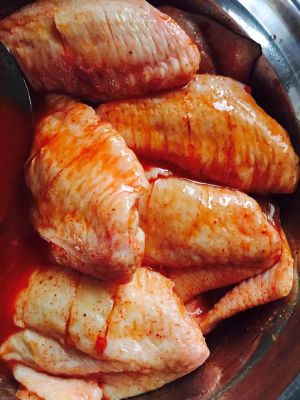 鸡翅多泡几遍,洗干净,加入胡椒粉、料酒、生姜再泡一会,可以去腥味。( 抱歉忘记拍照片了,下次再做的时候补上。)