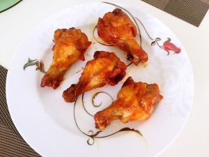 取出烤翅,再次把腌制的调料刷在烤翅上,最后再在烤翅上均匀的刷上一层蜂蜜。