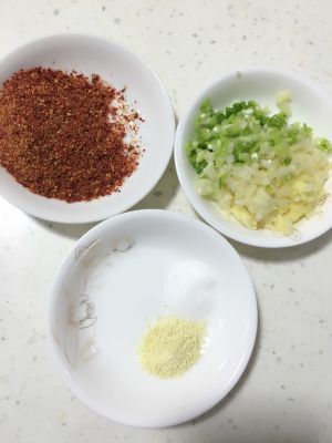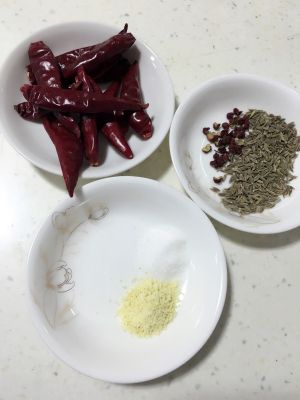 辣椒(不辣)3克,孜然6克,花椒少许(前三样混合用打磨机磨成粉(没有磨粉机的可以买现成的辣椒孜然花椒粉配),盐3克,鸡精1克