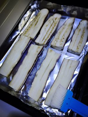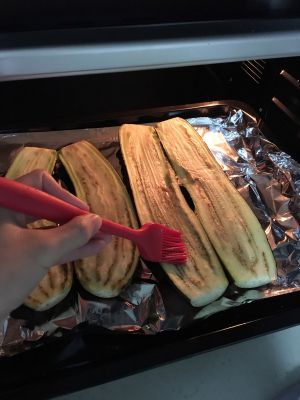 茄子切好入上下火220度预热3分钟的烤箱,表面刷上一层油,烤15至20分钟,5分钟刷一次油,15分钟后用筷子戳,一戳到底便算熟了