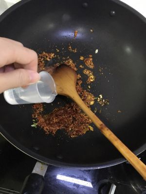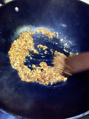 蒜末炒香,加入肉末,豆瓣酱,酱油翻炒