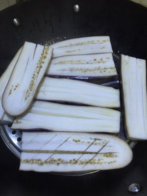 蒜,葱,辣椒切成末备用,茄子洗净擦干水分,横切成两分,再分别斜交叉打划刀撒些盐腌会。