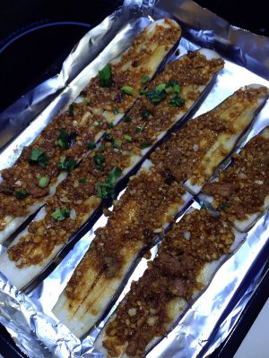 将调料铺盖在茄子上,放入烤箱150度烤30-40分钟。