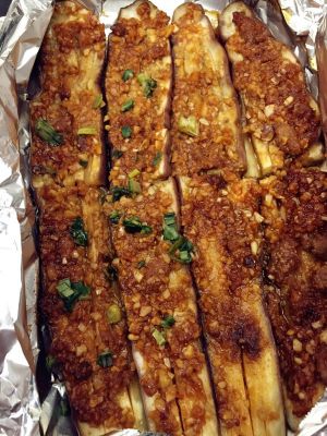 锅中放适量油烧5分热蒜末炒香倒入碗中,再把生抽,鼓汁油,辣椒,葱搅拌匀,在烤盘中垫锡箔纸,摆好茄子,再把调好的汁铺在茄子上。