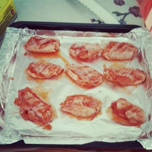 鸡翅与调料拌匀淹制20小时,烤盘铺锡纸放上鸡翅。