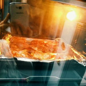 取出翻面,浇上剩下的料汁。再烤5分钟。