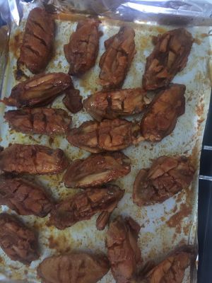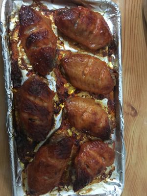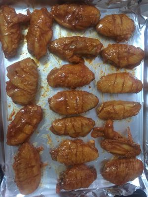 鸡翅放冰箱腌制一夜,烤箱200°预热10分钟,在烤网上铺上锡纸,放上鸡翅,再刷一层腌料,放进烤箱烤10分钟。