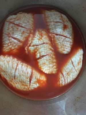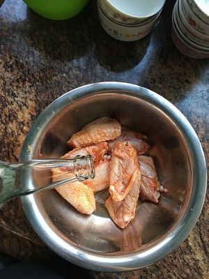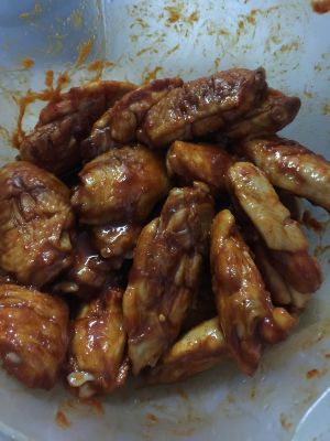 鸡翅洗干净,两面都划上两刀,加入1当中的酱料,加点酱油,让颜色更漂亮,也更入味。