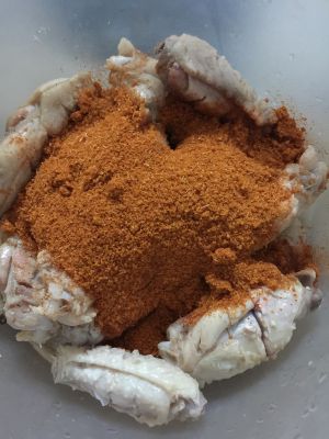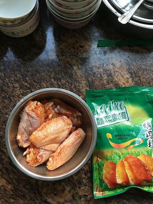 这是35克的烤翅腌料,够腌制最多20个鸡翅中的。把里面的粉倒出来放少量水调成糊。
