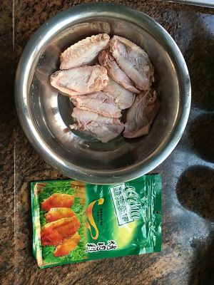 把清洗好的鸡翅根放入化开的奥尔良粉中,放入姜丝,腌制过夜。