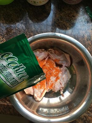 晾干水,加入新奥尔良烤肉料,抓均匀(可以用筷子搅拌,)