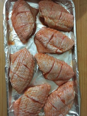 取出腌制好的鸡翅,摆在放了油纸的烤盘里,上下火200度烤20分钟,取出来翻面再150度烤15分钟,就可以上碟了。