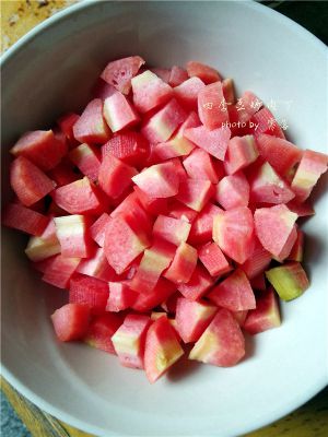 四季豆掐掉头尾,撕掉豆筋,洗净后,也切成丁;
