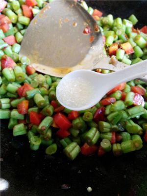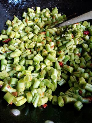 锅中倒油,加入腌好的猪肉丝翻炒,7成熟后加入青椒,放少许盐。最后加入四季豆加一碗水煮一下,同时放入蚝油,一大勺豆瓣酱和少许盐调味。