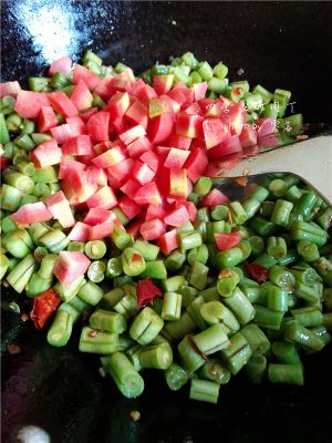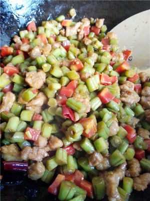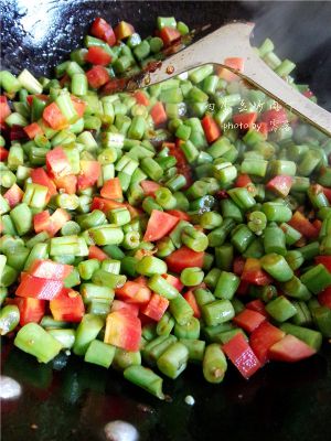 四季豆和胡萝卜都断生后,放入肉丁,一起翻炒;