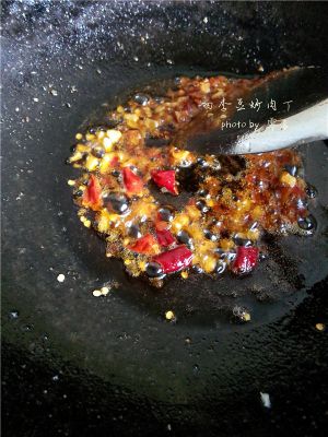 另起油锅,放入郫县豆瓣酱炒香,再放入干辣椒段,花椒炒香;