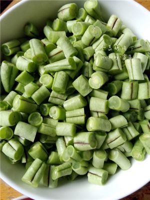 肉切片,倒入少许酱油淀粉抓匀备用。豆角头尾去丝掰成段儿备用。