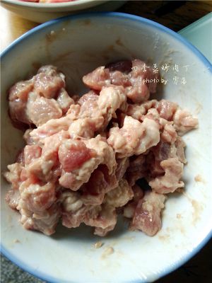 猪肉洗净切丁,用少许盐、料酒、水淀粉抓匀,腌制10分钟左右;