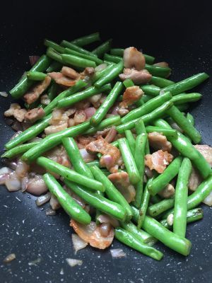 热油起锅,葱花爆香。放入豆角大火翻炒1分钟后倒入少许水,盖上盖子闷煮1~2分钟。豆角变绿后倒入肉片继续翻炒一分钟,加入适量酱油、盐然后继续翻炒一分钟后出锅。
