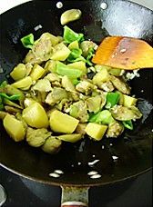 将油倒出,蒜粒放入锅中爆香,倒入茄子和土豆翻炒,加入尖椒块,加入一勺酱油翻炒均匀