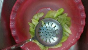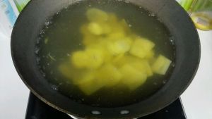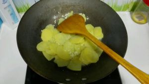 用烫完茄子的水将土豆也烫到八九成熟,就是勉强能吃了还有些硬的时候捞起,沥干水分