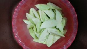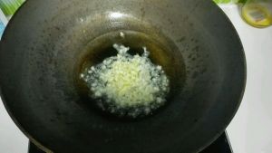 切蒜粒,油(因为茄子吸油,放入比平时炒菜多二分之一的油)入锅炒香蒜粒
