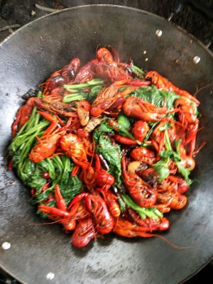 放花生油,把花椒、干辣椒等等一起爆香。然后放小龙虾一起炒一下。最后发放水煮30-60分钟,这样子才进味。