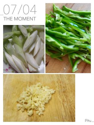 大葱洗净切片,蒜头切碎,青椒洗净切丝放在盘中备用