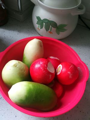 准备一个泡菜坛,适量的萝卜,红色萝卜四川叫胭脂萝卜,泡泡菜很脆,而且一坛水都是粉红色的哦