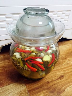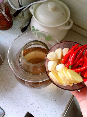 将搅拌好的水倒入泡菜坛中,把准备好的辣椒姜蒜放入,倒入适量白酒加入冰糖或者黄糖